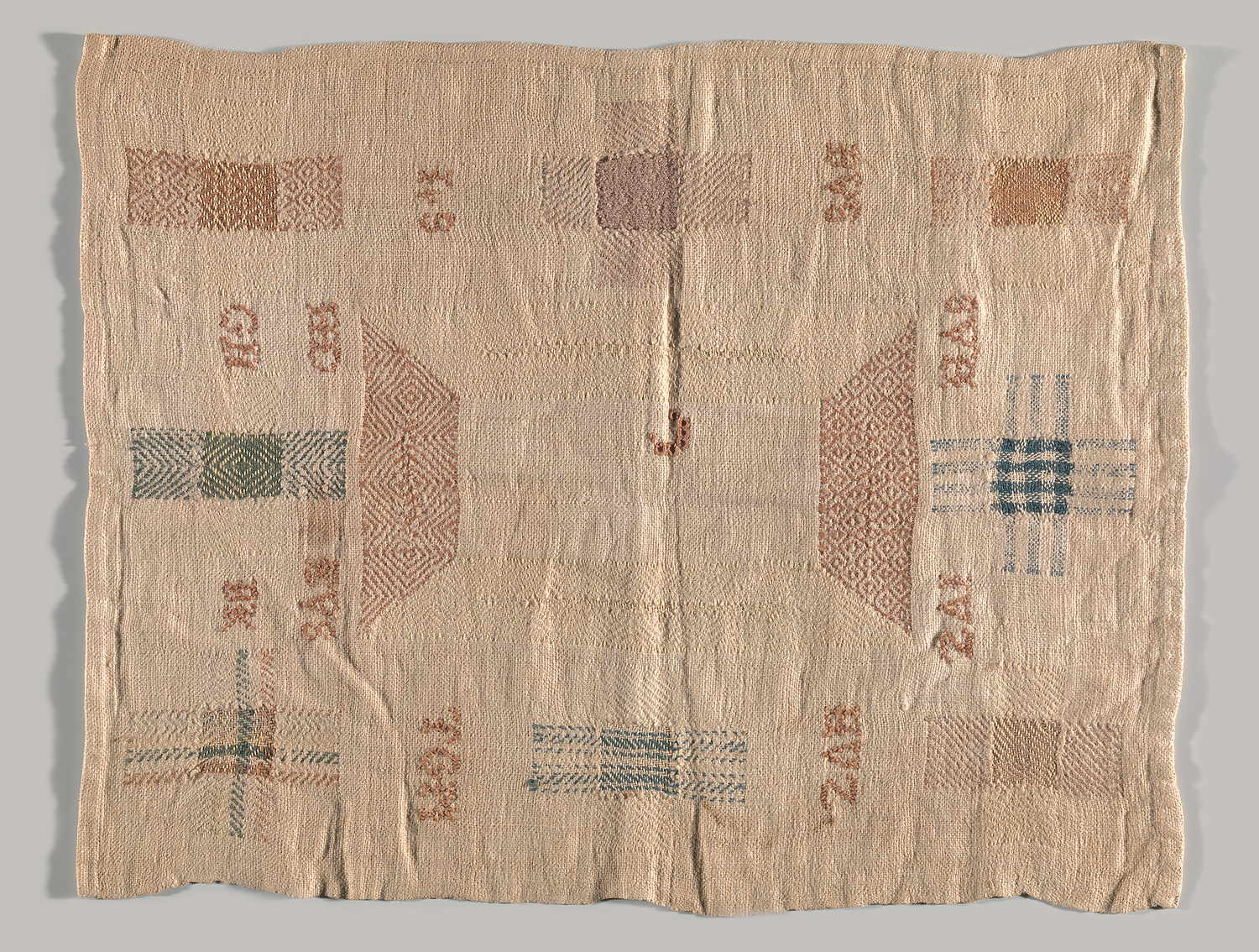 Deze stoplap uit circa 1775, heeft een langgerekt middenkader met daaromheen acht stoppen van gelijke grootte. Bijna alle stoplappen van dit type zijn vierkant. Deze lap niet. Door de rechthoekige vorm van het middenkader meet de doek 35 bij 27 cm. De naam van de borduurster is niet bekend. Het jonge meisje werkte met zijden en linnen garen op grof geweven linnen. Voor de stoppen koos zij voornamelijk aardetinten, met hier een daar een beetje groen afgewisseld met wat petroleumblauw. Het middenkader is uit de doek geknipt en met behulp van twee langgerekte en twee korte sneestoppen weer teruggeplaatst. In het centrum van de doek is een begin gemaakt met wat een initiaal zou kunnen zijn. Zeker is het niet. Ze gebruikte hiervoor de dubbele stersteek. De overige initialen, die in kruissteek uitgewerkt zijn, lijken geen direct verband met elkaar te houden. (Suzette van 't Hof)