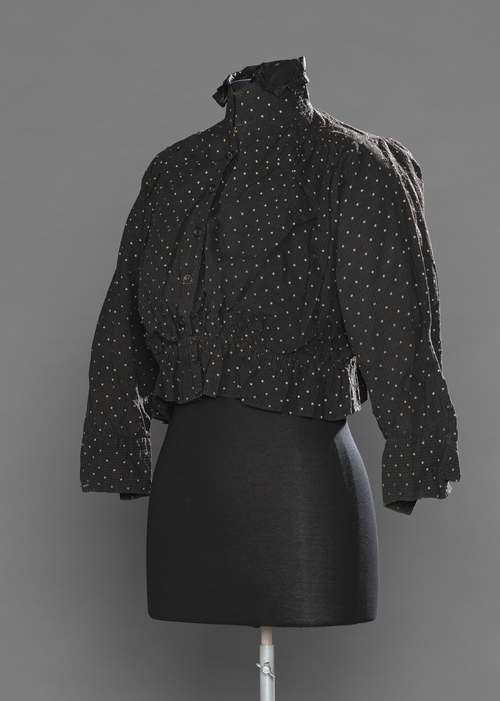 Zwarte blouse met cremekleurige stippen, hoge boord, lange mouwen en knoopsluiting middenvoor. Langs de boord een kraagje met open werk. In de hals aan de binnenzijde een lus. Daagse, eenvoudige blouse voor een grotere maat.