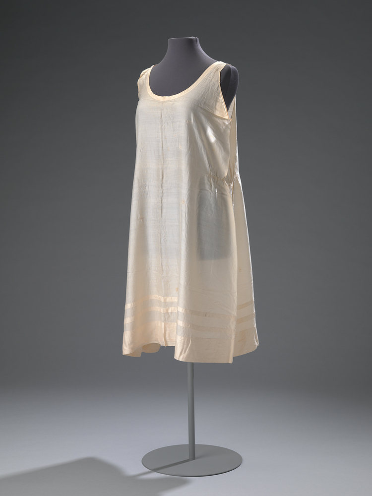Cremekleurige zijden onderjurk met sluiting achter, met ingeplooide heup en oprijgsels. Ouderwets model.- Trefwoorden