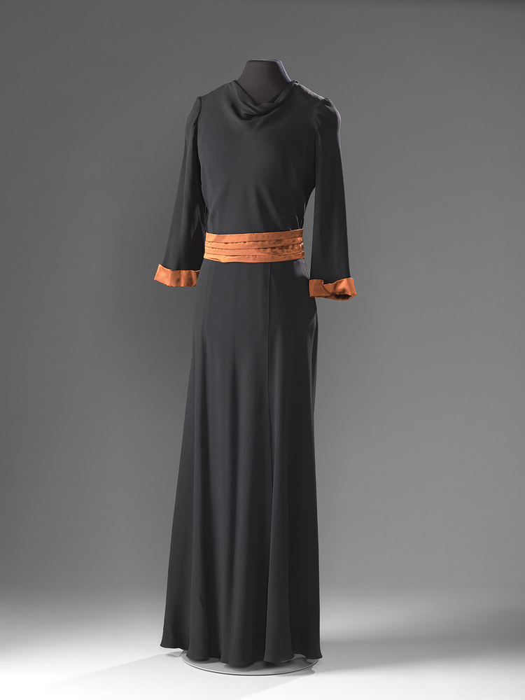 Zwarte japon met driekwart mouwen, hoge hals en rok in schuingeknipte banen. Schoudervullingen van het merk Twin. Links in de taille een ijzeren rits. Manchet en ceintuur met vier stroken van bruin satijn. Waarschijnlijk waren de mouwen van de japon nauwsluitend aan de uiteinden en zijn de satijnen manchetten er later op gezet. Het ceintuur is te wijd voor de japon.