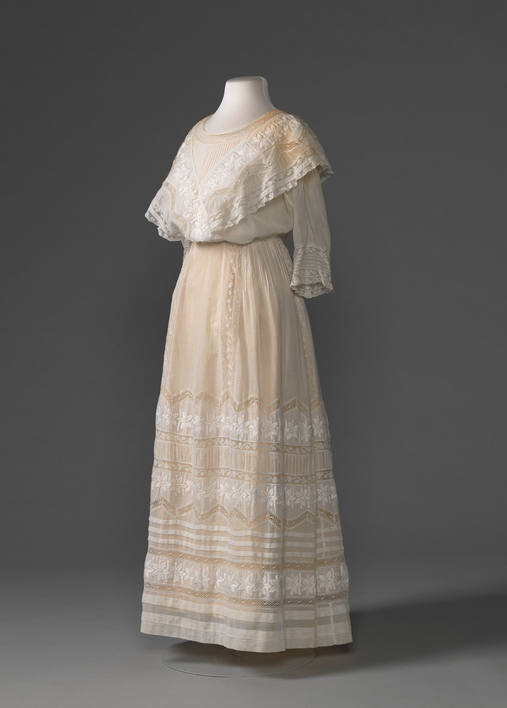 Witte modieuze zomerjapon met halflange mouwen, verhoogde taille, met Iers haakwerk en open zomen. Het lijfje is bloezend, de rok valt glad rond de heupen en loopt dan iets gerend uit. De manier van drukknopen naaien wijst op datering begin 20ste eeuw. De tailleband werd naar binnen gevouwen om de rok iets omhoog te houden voor het effect van een verhoogde taille.