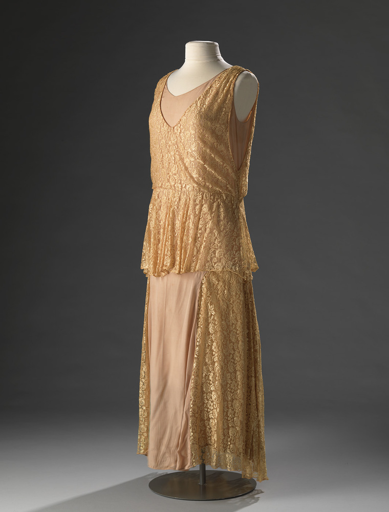 Avondkleding in de jaren ’20 volgt vrijwel dezelfde lijn als de kleding voor overdag, alleen het tonen van meer huid, en andere materialen, onderscheidt de avondkleding van de daagse kleding. Het gebruik van verschillende soorten stof en meerdere lagen stof zorgen voor een vloeiende beweging van de japon. ( Leonie Sterenborg)