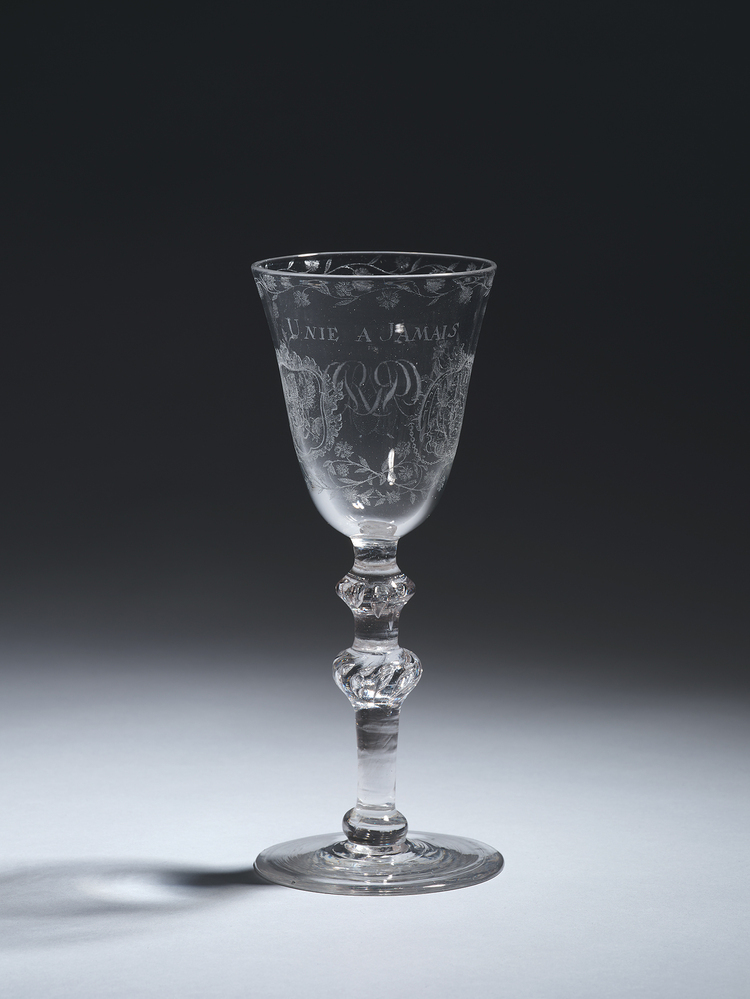 Helder kleurloos glas. Platte voet. Basisknoop. Balusterstam met dubbele rij gedraaide luchtbellen en knoop met luchtbellen. Conische, licht uitbuigende kelk. Op kelk twee rococo cartouches waarin de wapens van Cornelis G.J. van Wyckerslooth en Geertrudis Maria Roest van Alkemade. Aan weerszijden bloem- en bladranken, doorlopend rondom bovenzijde kelk. Tussen de wapens twee vlammende harten, doorboord met een pijl. Hierboven het opschrift: UNIE A JAMAIS/ (Voor eeuwig verbonden). Op andere zijde kelk het spiegelmonogram: CRW/.