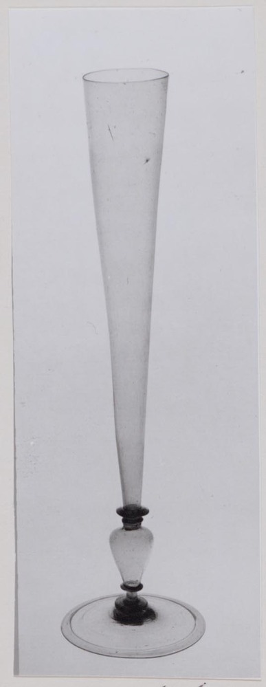 Helder kleurloos, grijs getint glas. Licht conische voet met omgeslagen rand. Basisschijf. Holle balusterstam met twee schijven. Hoge conische kelk.- Trefwoorden