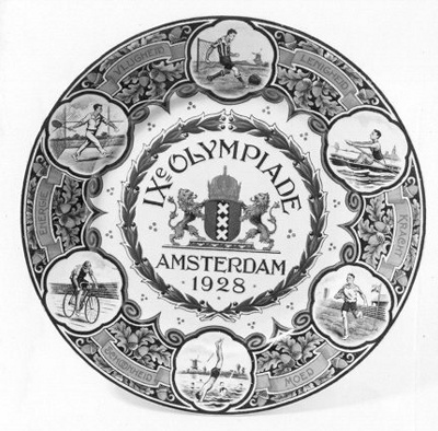 Rond aardewerk bord, zwarte druk. Middenin een groene lauwerkrans is in zwart het stadswapen afgebeeld. Boven wapen, tekst in zwart: IXe OLYMPIADE; onder wapen, tekst in zwart: AMSTERDAM/ 1928. Op bordrand zijn in cartouches zes sporten afgebeeld (zwart), met daartussen eikenloof (zwart) en eikels (oranje). Over eikenloofdecoratie liggen zes oranje banderolles met opschriften: SCHOONHEID/ ENERGIE/ VLUGHEID/ LENIGHEID/ KRACHT/ MOED.