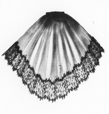 Jabot van zwarte gepliseerde tule met zwarte machinale kant. Met speld om aan de achterkant op de boord vast te zetten.- Trefwoorden