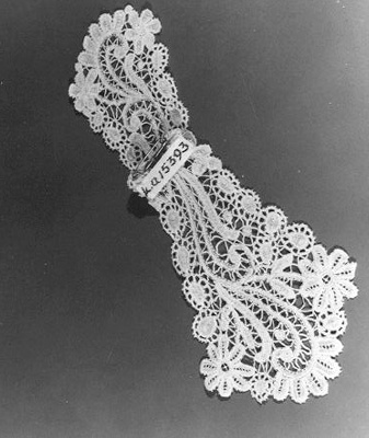 Witte dubbele handgekloste jabot, met speld om vast te zetten net onder de boord.- Trefwoorden