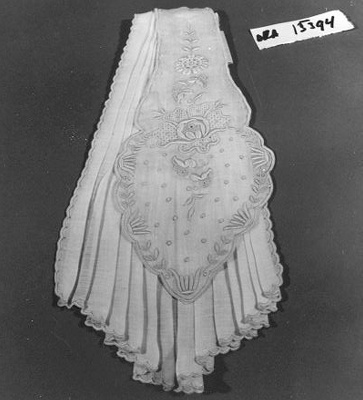 Witte jabot van geplisseerde katoen met daarover witte handgeborduurde katoen. De jabot is nog helemaal nieuw en niet gewassen. De prijs zit er nog aan, en de blauwe ondertekening van het borduursel is nog zichtbaar. Deze blauwe ondertekening verdwijnt na de eerste keer wassen. De prijs is 12 gulden.- Trefwoorden