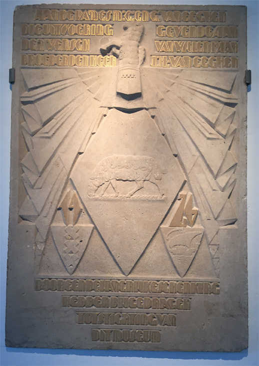 opschrift boven- en onderzijde: AAN DE DAMES M.EN C. VAN EEGHEN/DIE UITVOERING GEVENDE AAN/DEN WENSCH VAN WYLEN HAAR/BROEDER DEN HEER/J.H. VAN EEGHEN/DOOR EEN BELANGRIJKE SCHENKING/HEBBEN BYGEDRAGEN/TOT STICHTING VAN/DIT MUSEUM