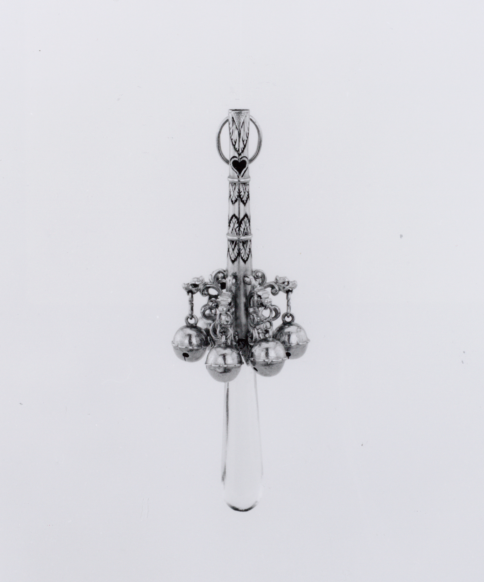 Rammelaar met zes bellen en een fluitje. Taps toelopende steel en pegelvormig uiteinde van geslepen bergkristal, tevens als handgreep dienend. Bovenzijde steel met fluitje met hartvormige opening en ring ter bevestiging aan thans niet meer aanwezige ketting. Onderzijde steel met zes armen in de vorm van wit geëmailleerde dierenkoppen met rode oogjes waaraan zes ronde bellen hangen. Langs mondstuk fluit en op steel gestileerde acanthusbladeren, geaccentueerd met zwart email.