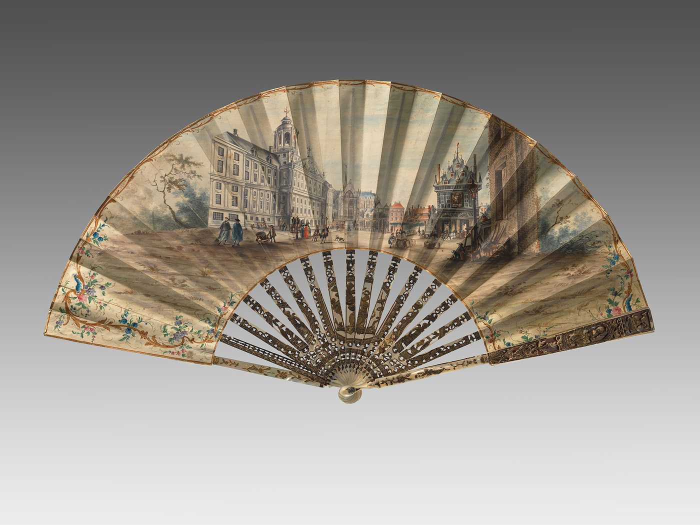 Vouwwaaier met parelmoeren bewerkte benen en papieren beschilderd blad. Op het blad staan het Paleis op de Dam, de Nieuwe Kerk, de Waag en Huize Kostverloren afgebeeld, met verschillende figuren en dieren. Langs de randen een motief van bloemen.- Trefwoorden