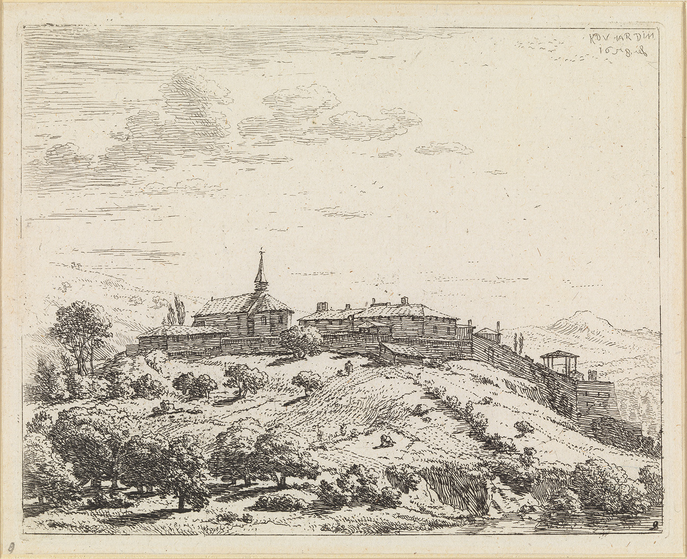 - opschrift r.bov. in de plaat: K.du Jardin 1658 fec (fec. in spiegelschrift)