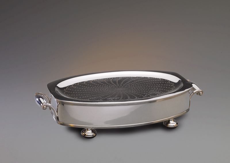 Rechthoekig komfoor van een tafelservies, met gebogen zijden en afgeronde hoeken op vier afgeplat bolvormige pootjes, de onderste helft van ebbenhout. Gladde wand, de onder- en bovenrand met filetranden. Korte zijden met twee oren, elk samengesteld uit twee gebogen steunen, twee ivoren tussenringen en spoelvormige greep. Op komfoor losse bovenplaat met verdiept middenveld waarin gaatjespatroon in de vorm van een bloem.