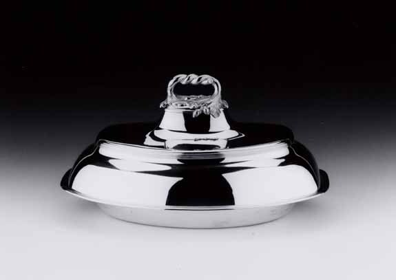 Ovale dekschaal van een tafelservies, elk met afgeknotte korte zijden en brede vlakke rand met opgelegde filetranden. Deksel met afgeknotte korte zijden en convex gewelfd ondergedeelte en concaaf gewelfd bovengedeelte, door middel van filetrand van elkaar gescheiden. Dekselknop in de vorm van twee ineengedraaide bladertakjes met eikels, van later datum. Op binnenzijde rand deksel is gegrift: I/.