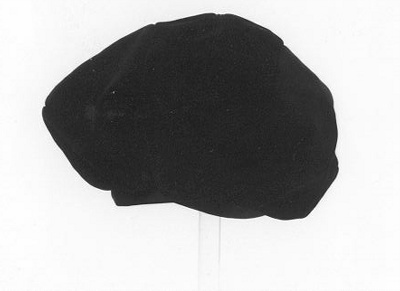 Baret van zwart en grijs fluweel en groene satijnen strik middenvoor.- Trefwoorden