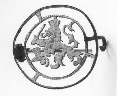 Broche, verkregen door het zodanig uitzagen van een bronzen halve stuiver ( 2½ cent ), dat de leeuw en een krans van oranjetakken zijn overgebleven. Dergelijke broches werden gedragen als bewijs van vaderlandsliefde. In deze geest werden ook armbanden , kettinghangers , lepeltjes e.d. uit verschillende munten vervaardigd.