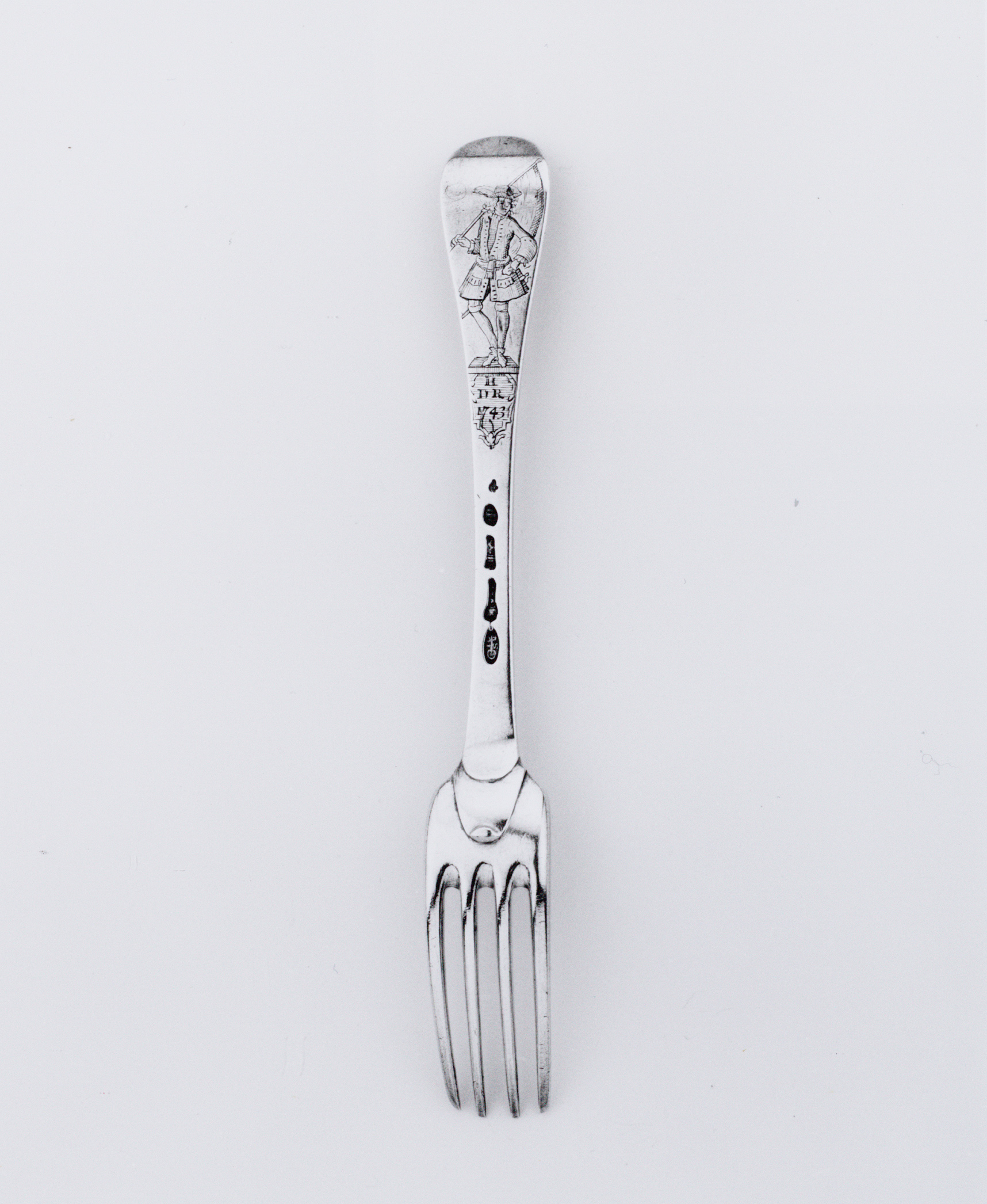 Vork, steel met middenribbe en afgeronde opstaande kop, dubbel Amsterdams lof. Op onderzijde steel is een voorstelling gegraveerd van een vaandeldrager van de schutterij, staand op een voetstuk. Hieronder de initialen: H/ DR/ en het jaartal: 1743/, omgeven door lofwerk.