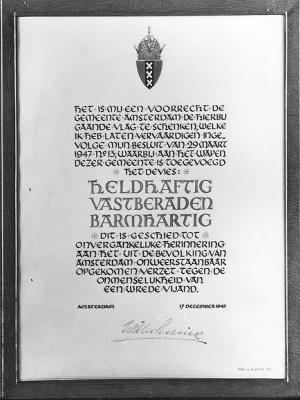 Oorkonde, behorend bij vlag (KA 16069.1/2), waarin koningin Wilhelmina haat besluit toelicht om het devies 'Heldhaftig, Vastberaden, Barmhartig' aan het stadswapen toe te voegen. Ondertekend door koningin Wilhelmina.- Trefwoorden