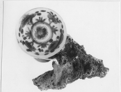 Deze twee drinkschaaltjes komen uit het schip De Witte Leeuw, dat in 1613 bij Sint Helena is vergaan. Zij hebben zo lang op de bodem van de zee gelegen dat ze zijn vastgekoekt in het koraal, samen met de peperkorrels waarin zij waren verpakt om beschadiging tegen te gaan. ( Olga Ruitenbeek)