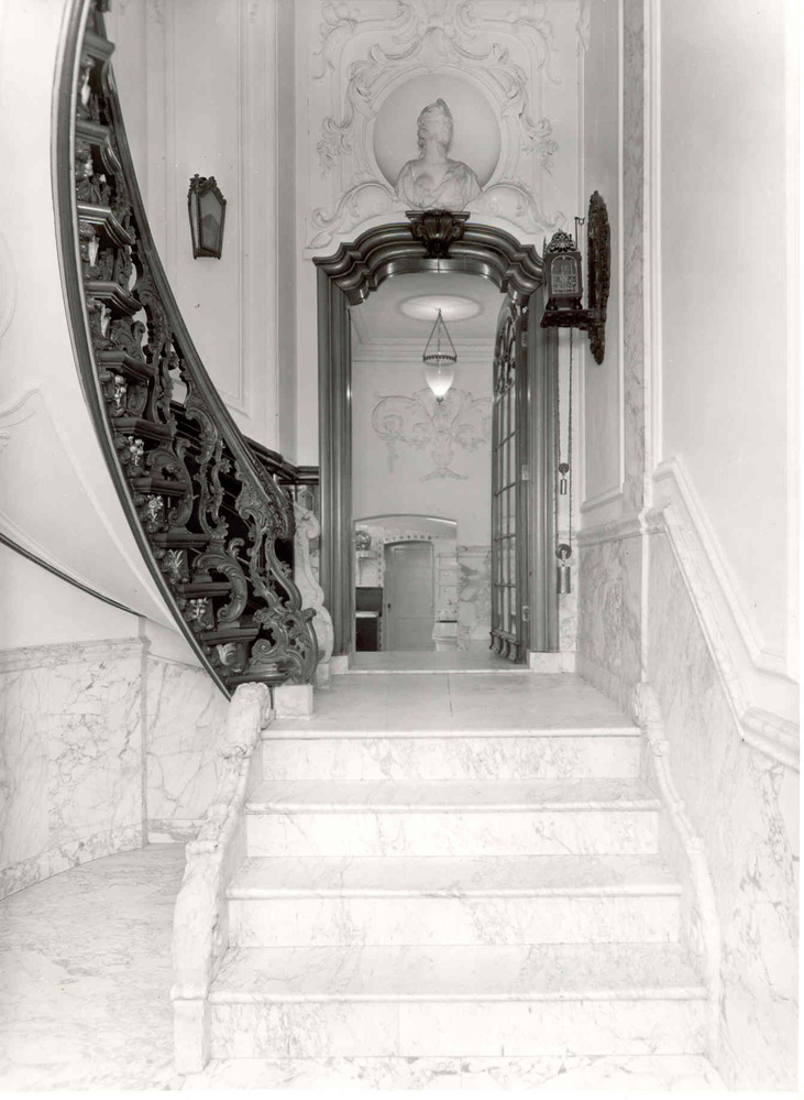 De trap bestaat uit een trapje van drie marmeren treden naar een bordes. Hier begint de wenteltrap met marmeren treden, leuning van mahoniehout en een marmeren lambrisering. De wanden zijn met stucwerk versierd. Onderaan de wenteltrap zit ook versierd stucwerk. Boven en doorgang vanuit het bordes is een nis met een marmeren beeld. Onder de trap is een fonteintje.- Trefwoorden