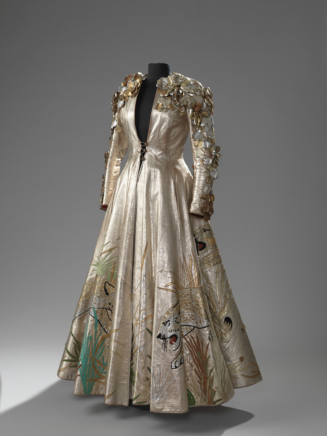 Mantel van goudkleurig leer. De enkellange hele cirkelrok is in 12 uitlopende banen geknipt. De schouderpas en de bovenkant van de mouwen zijn bedekt met rozetten in verschillende kleuren goud- en zilverkleurig leer. Op de rok zijn applicaties aangebracht van sluipende luipaarden.