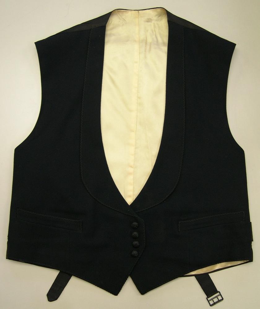 Shawlkraag; randen zijn versierd met een smal zijden bandje, zo ook de onderkant en de klepzakjes. Achterpand van zware tafzijde, 2 bandjes met als sluiting een zwart geverfde metalen gesp.