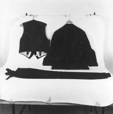 BROEK: Zwarte wol, vaag visgraatweefsel, langs de zijnaden als versiering zwart zijden banden.- Trefwoorden