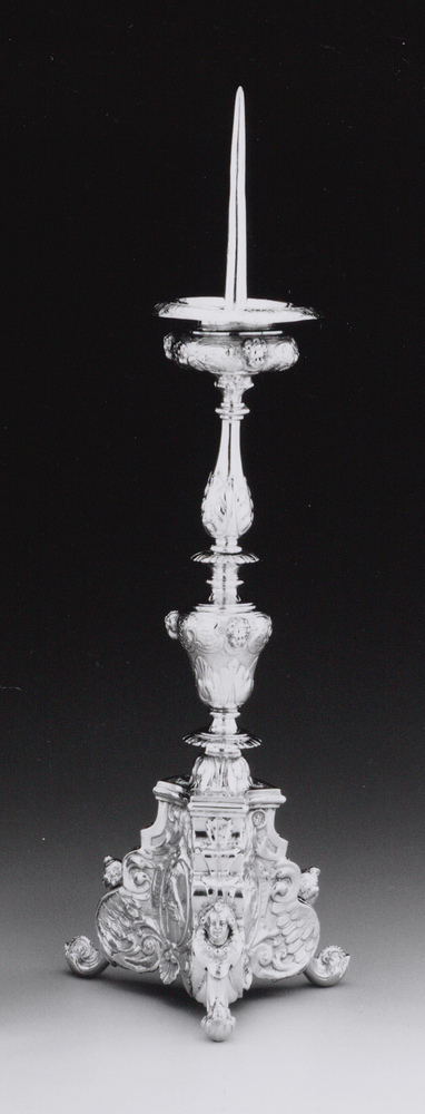 Driezijdige kandelaar met hoge voet, dubbele balusterstam en schijfvormige kaarsenhouder. Afgeschuinde hoeken voet met vrijstaande cherubijnenkopjes, de vleugels doorlopend op zijden voet. De onderzijden uitlopend in drie poten in de vorm van omkrullende bladvoluten. Zijden voet met ovale medaillons met cartouchevormige omlijstingen in kwabstijl, waaronder schelpmotieven. Medaillons met: St. Agnes met lam, St. Barbara met toren en St. Margaretha met draak. Voet met zich verjongend middendeel met afhangende acanthusbladeren. Op onderzijde voet is gegraveerd: 1638/. Stam met afgeplatte knopen en geschulpte kragen, waartussen nodus en baluster. De nodus vaasvormig, versierd met acanthusbladeren, palmetten en cherubijnenkopjes; de baluster versierd met acanthusbladeren en palmetten. Kaarsenhouder met cherubijnenkopjes, alternerend met vruchtentrossen. Vetvanger met afhangende rand van godrons. Kaarsenpin.