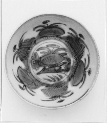 versierd met eend onder een lotusblad plus bloem, links een bloem rechts een groepje bloemen- Trefwoorden