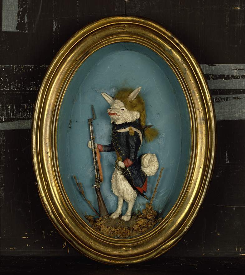 Geuniformeerde keeshond in hoogreliëf, achter glas. In koperen lijst. Op achterzijde spotdicht op de patriotten.- Trefwoorden