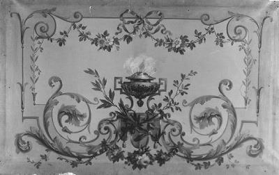 Een stuk behangsel op raam. Op de hoofdzakelijk lichtgroene achtergrond prijkt een decoratieve compositie van voluten en bloemslingers. In het midden aan de onderkant zijn twee gekruiste takken, waarboven zich een wierookvat bevindt.- Trefwoorden