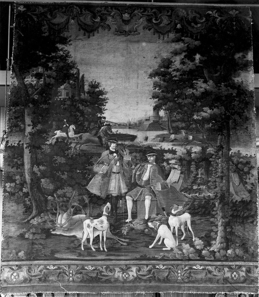 Landschap met geboomte en in het midden, op de achtergrond water. Op de voorgrond twee heren van wie één zittend, met hoorn, en de ander met in elke hand een vogel. Vóór hen een dood hert en honden. Meer op de achtergrond twee ruiters van wie de voorste een geweer afschiet.