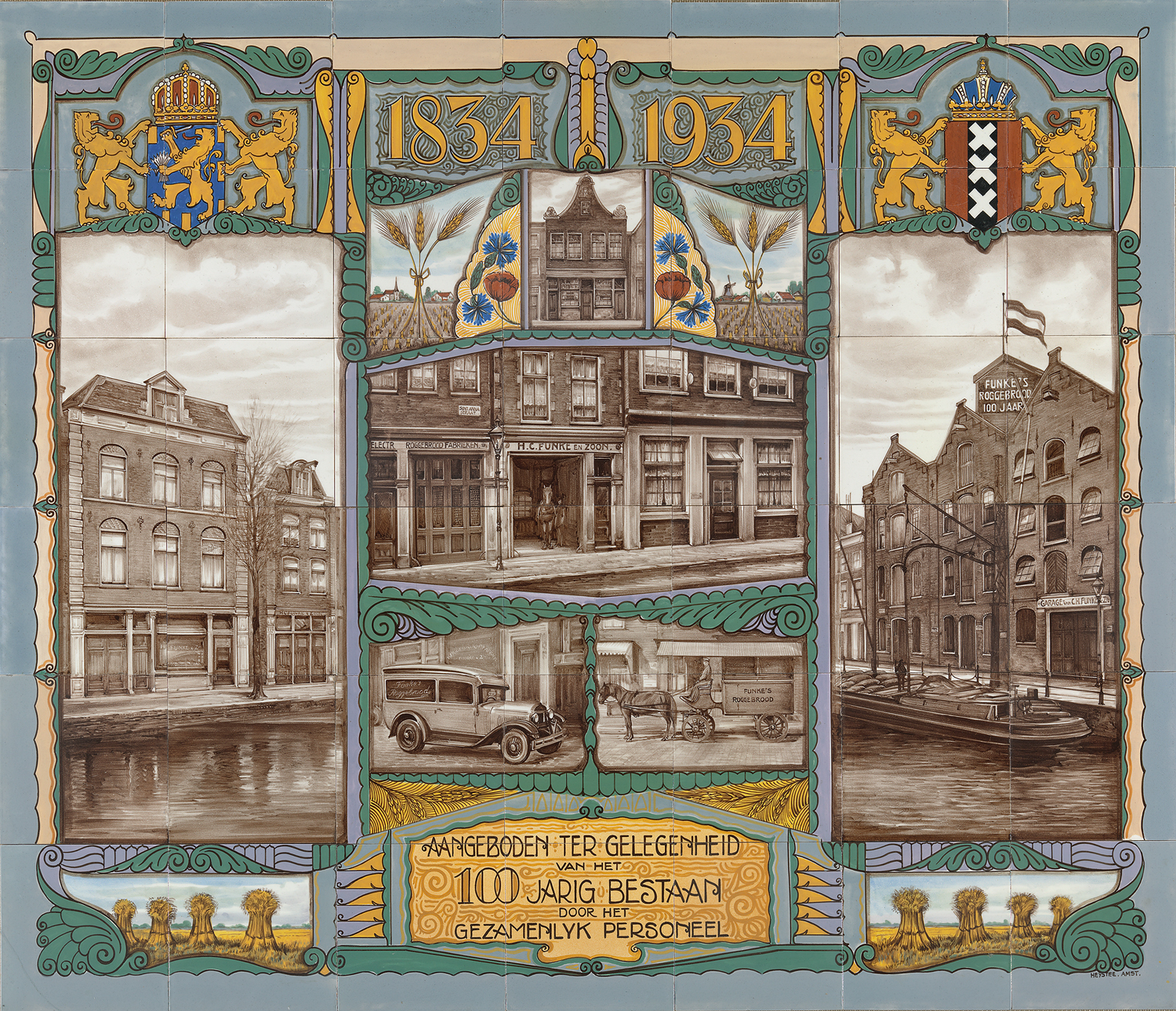 Een tegeltableau is een vlak, bestaande uit meerdere aardewerken tegels, die door een schildering één voorstelling vormen. Tegeltableaus werden vanaf de zeventiende eeuw populair, omdat ze zowel decoratief als functioneel waren. Ze boden uitkomst tegen vocht, waar huisjes langs grachten en kanalen nogal eens last van hadden, en waren gemakkelijk schoon te houden. Daarnaast zorgden de uit Italië afkomstige vormen, kleuren en motieven voor een vrolijke aanblik rond de haard of in de gang. In de periode van de Jugendstil (ca. 1900) leefde de aandacht voor tegeltableaus opnieuw op. Families en bedrijven die het zich konden veroorloven, lieten wanden, gevels en portieken versieren met tegeltableaus in Art Nouveau stijl. Ook voor jubilea en andere feestelijke gelegenheden werden soms tegeltableaus vervaardigd. Dit tegeltableau is door plateelbakker Heystee's Tegelhandel N.V. vervaardigd ter gelegenheid van het honderdjarig bestaan van Funke's Roggebroodfabriek in 1934. ( Sarah Remmerts de Vries)