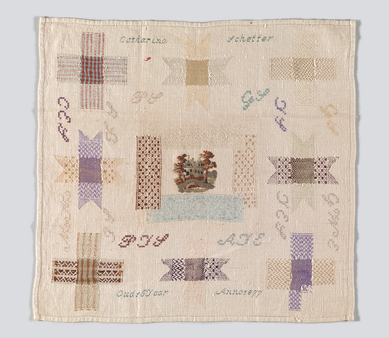 opschrift tegen de onderrand van de doek: Oud18Jaar / Anno 1877: leeftijd borduurster, jaar voltooiing doek