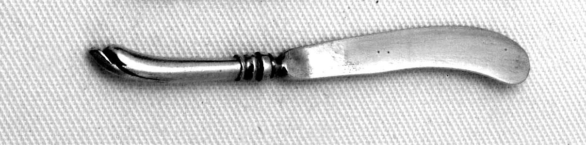 Lemmet is spatelvormig met ingesnoerd aanzet, pistoolvormig handvat.- Trefwoorden