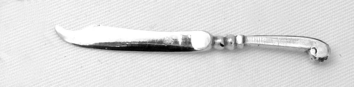 Lemmet met licht gebogen snede, oplopend snijpunt, holling op de punt van de rug, vierhoekig pistoolheft met geprofileerde hoeken, onderste eindigend in een krul.- Trefwoorden