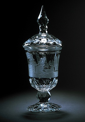 Helder kleurloos glas. Conische, licht ingesnoerde voet met geschulpte rand. Korte stam met knoop. Cilindrische kelk met afgeronde basis. Op kelk een kraamkamer met kraamvrouw in bed, baker met wieg, luierwarmer met kleed, vier stoelen en een tafel met twee dekselbekers en een fles. Boven de voorstelling het opschrift: HET.WEL.VAAREN.VAN.DE.KRAAM.VROUW.EN.KINDIE./. Onder mondrand een decoratieve band. Gewelfd deksel met samengestelde, puntige knop. Rondom dekselrand bloem- en bladmotieven. Voet, stam, basis kelk, deksel en knop gefacetteerd. Gepolijste details.