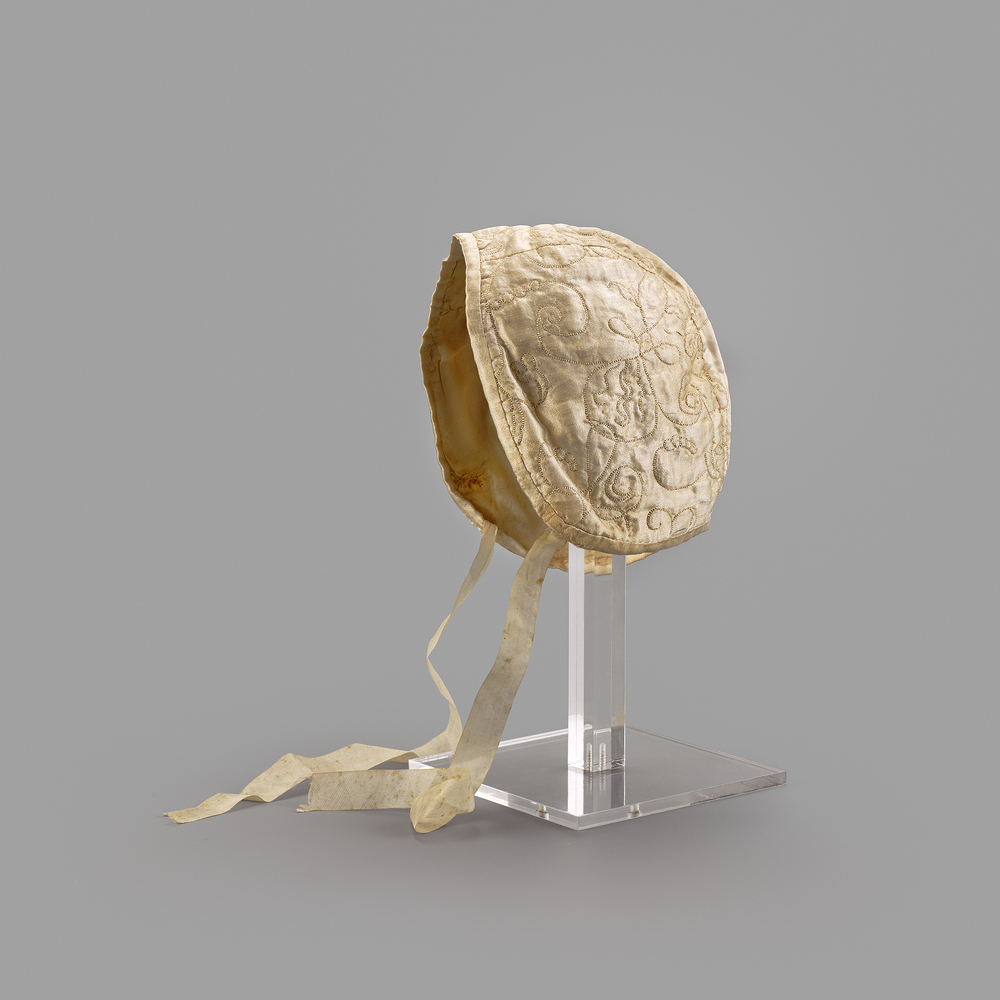 Cremekleurige doorgestikte muts van zijde voor een meisje. Gevoerd met beige zijde. Twee zijden linten om onder de kin te strikken. Oude zijde.