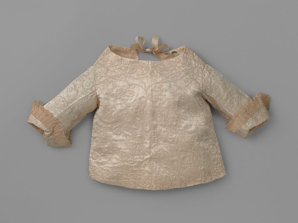Cremekleurige kinderjak voor een jongen (vanwege de machetten) van satijn geborduurd met stiksteek in een slingerend patroon van krullen. Het borduursel volgt de patroondelen van het jak, met een rand langs de hals, achtersluiting en onderkant. Langs de manchetten een geplooide kanten rand. Voering van cremekleurige zijde. Bijzonder jak.
