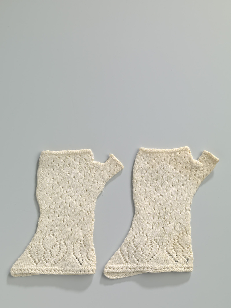Witte gebreide mitaine van katoen voor een jongen, voor de rechterhand. Vormgegeven naar een jongensmouw. Bijzonder. Hoort bij KA 17617.