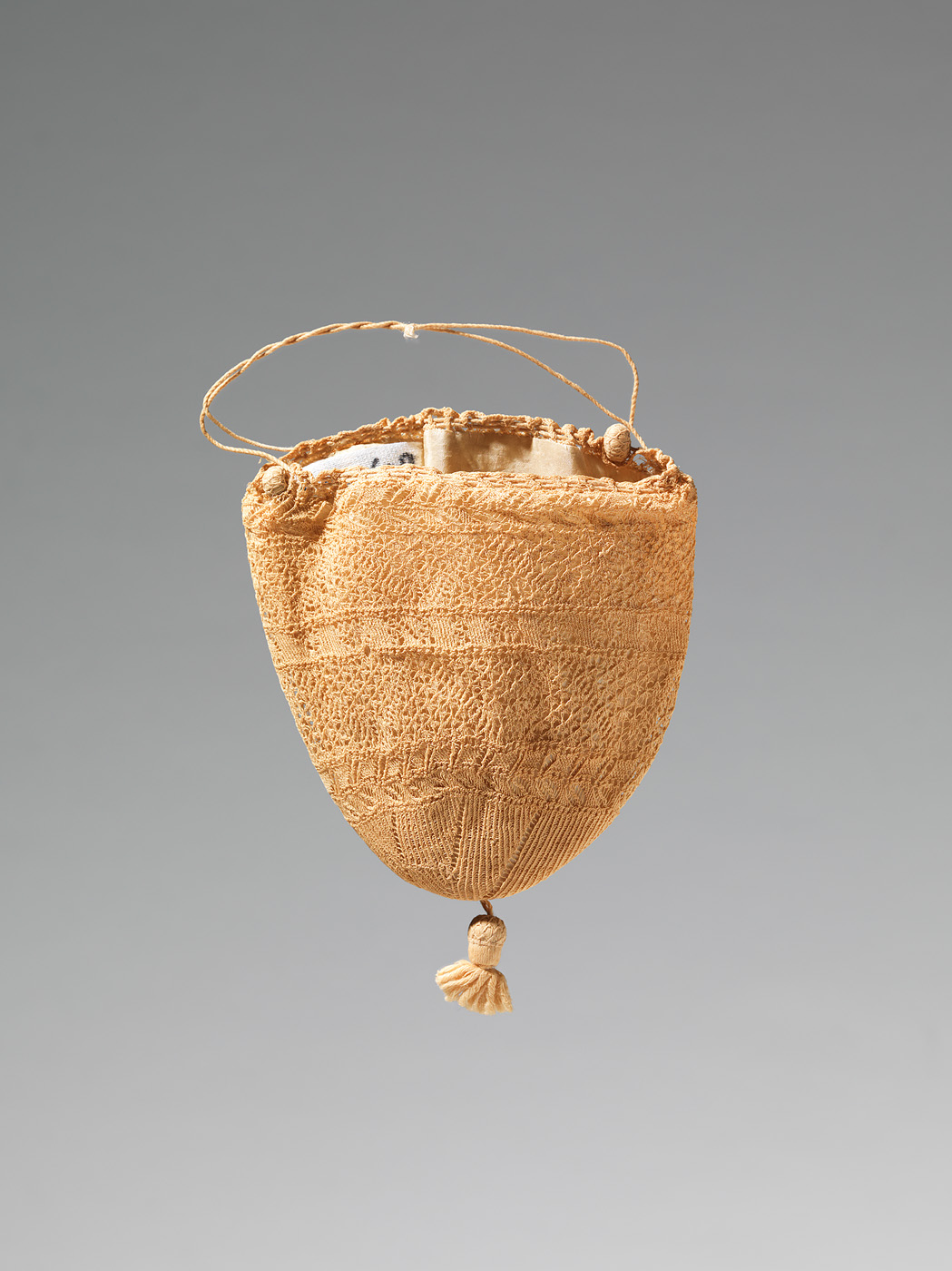Handgebreid handtasje van zeer fijn garen. Schuifkoordje. Onderaan kwastje. Gevoerd met zijde.- Trefwoorden