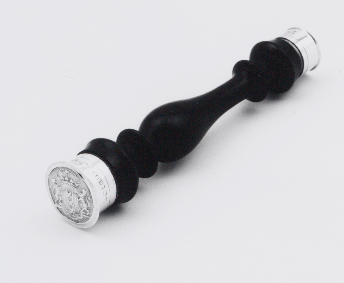 Balustervormig, geprofileerd ebbenhouten stokje met breed en smal uiteinde, elk gevat in een cilindervormige dop van zilver. Beide doppen met een vlakke, uitstekende bovenrand en gegroefde rand langs onderzijde. Bovenzijde grote dop met in reliëf op een geruwde ondergrond het gekroonde wapen van Amsterdam, gehouden door twee leeuwen. Op wand is gegraveerd: David Kraijschot/. Bovenzijde kleine dop met in reliëf op een geruwde ondergrond de letters: MKRS/ in monogram (medeklinkers in het woord makelaars) binnen parelrand. Op wand is gegraveerd: Anno 1795/.