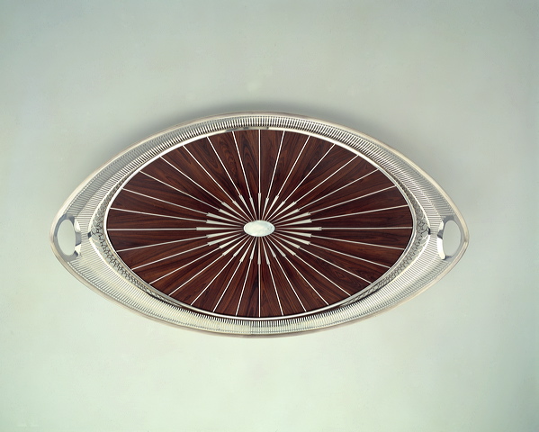 Spits ovaal blad met uitbuigende, in traliewerk en kleine cirkels opgengewerkte wand, de korte zijden met ovalen en cirkels. Wand naar de korte zijden zich verbredend en oplopend waarin ovale handvatten zijn uitgespaard. Op rand filetranden. Bodem van koningshout op eikenhouten kern, ingelegd met ovaal middenstuk van parelmoer en straalsgewijze pijlen van zilver. Glazen bodemplaat met twee zilveren pionvormige greepjes met ringetjes van later datum.