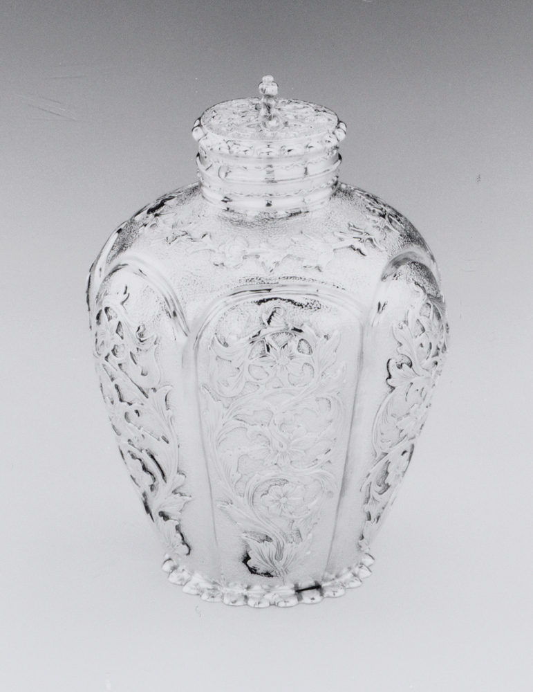 Ronde theebus met deksel. Geschulpte voetrand. Eivormig lichaam met zeslobbige wand waarin zes velden. Elk veld met in cut-cardtechniek opgelegde bloem- en bladranken op een geponste ondergrond, de ranken alternerend naar links en rechts gewend. Op schouder in cut-cardtechniek een krans van bloemen en bladeren. Cilindrische hals en omsluitend deksel met geschulpte rand, de bovenzijde plat. Op deksel in cut-cardtechniek straalsgewijs zes bloemen en geprofileerde knop. Sporen van verguldsel op alle onderdelen. Op onderzijde bodem is gegrift: W.g.l.W./ N.2./ 1351/ D 4339/ 403/ slt/.