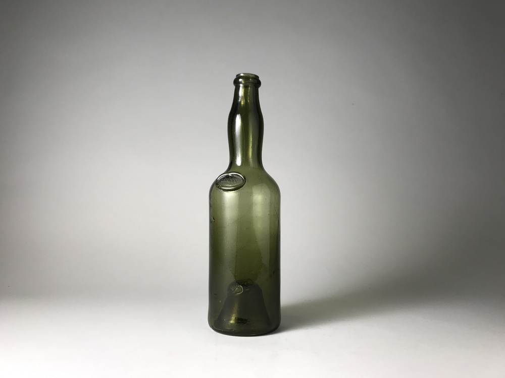 Olijfgroen glas. Ingestoken bodem. Cilindrisch lichaam met afgeronde schouder en opgebolde hals met glasdraad. Op schouder een glaszegel met het opschrift: MADERE/.