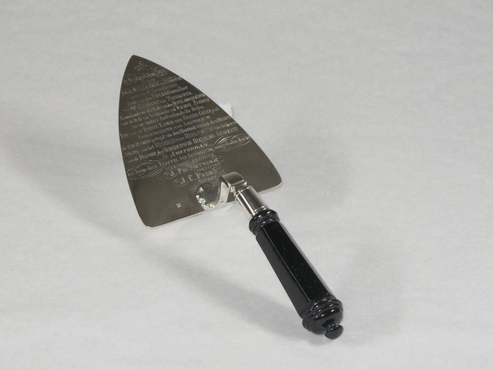 Troffel met driehoekig blad met licht gebogen lange zijden, S-vormige steel met bladvormige aanzet en manchet met geprofileerd zeshoekig ebbenhouten handvat, eindigend in een knopje. Op bovenzijde blad is tussen decoratief krulwerk gegraveerd: Op Vrijdag 29 Juni 1888/ IS DOOR/ DAVID, WILLEM, HACKE VAN TIENHOVEN,/ geboren 31 December 1880,/ Zoon van den Edel Achtbaren Heer/Mr GYSBERT van TIENHOVEN,/ Kommandeur der Orde van den NEDERLANDSCHEN LEEUW,/ van de Orde van Verdienste van WALDECK-PYRMONT/ en van andere Buitenlandsche Orden,/ LID VAN DE EERSTE KAMER DER STATEN GENERAAL/BURGEMEESTER VAN AMSTERDAM/ de EERSTE STEEN gelegd van den HOOFDGEVEL aan den BINNEN/ AMSTEL van het WEESHUIS voor WERKJONGENS ten behoeve/ van de DIACONIE der NEDERDUITSCHE HERVORMDE GEMEENTE/ te AMSTERDAM/ en hem deze TROFFEL ter herinnering aangeboden door het/ WEESHUIS BESTUUR/ J,Ph: MEYNINK, VOORZITTER./ J,C, PROES, SECRETARIS./.