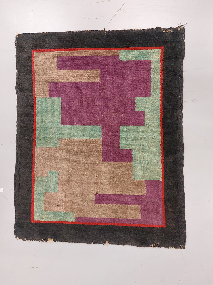 Kleedje, lichtgrijs fond, asymmetrische motieven in de kleuren: zand, rood, paars, groen en beige op lichtgrijs fond.- Trefwoorden