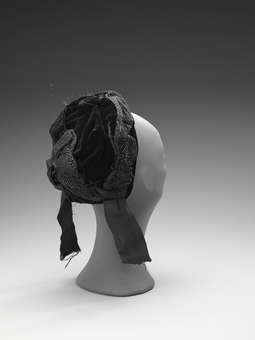 Dameshoed zonder rand. Kapothoed. Bol van zwart gerimpeld fluweel, versierd met een opgenaaide strook zwart kant waarop gitten. Korte afhangende ripslinten m.a., deel ontbreekt. Restant van een veer. Zwarte voeringzijde. Capote.
