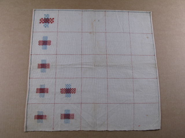 De stoplap van Johanna uit circa 1885-1890, is niet voltooid. Ze heeft een linnen doek van 39 bij 39 centimeter gebruikt, die ze met rijgsteken in rood en blauw in 25 vakjes heeft verdeeld. Daarbinnen oefent ze zeven stoppen. Eén rij van vijf is klaar. Er valt aan de opzet niet af te lezen of dit de linker- of rechterkant van de doek is of misschien wel de boven- of onderkant. De kruisstoppen zijn, ervan uitgaande dat eerste rij links geborduurd is, in dezelfde kleuren uitgevoerd: rood horizontaal en lichtblauw verticaal. De patroontjes variëren. Of Johanna moeilijkere stoppen in gedachte had, valt helaas niet te zeggen. Daar moeten we nieuwsgierig naar blijven.