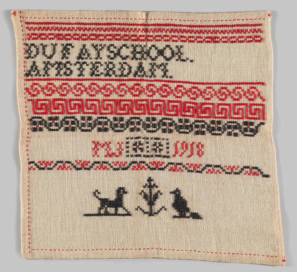 In 1918, amper tien jaar oud, maakt Maria dit merklapje dat 29,5 bij 31 cm meet. Ze gebruikt hiervoor rood en zwart katoenen garen op een katoenen ondergrond. Een vogeltje en hondje sluiten de rijen met siermotiefjes af. Dit bescheiden doekje steekt sterk af tegen de bewerkelijk doeken van haar verre voorouders Maria Block (KA 17267) en Joanna de Clercq (KA 17268).